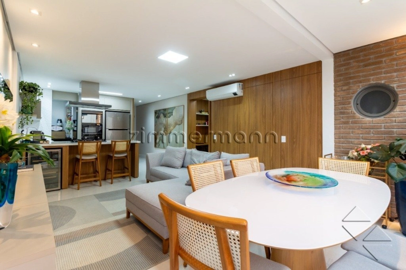 A área social integra sala de estar, sala de jantar e cozinha americana equipada, promovendo um ambiente moderno, funcional e bem iluminado além de contar com ar-condicionado e