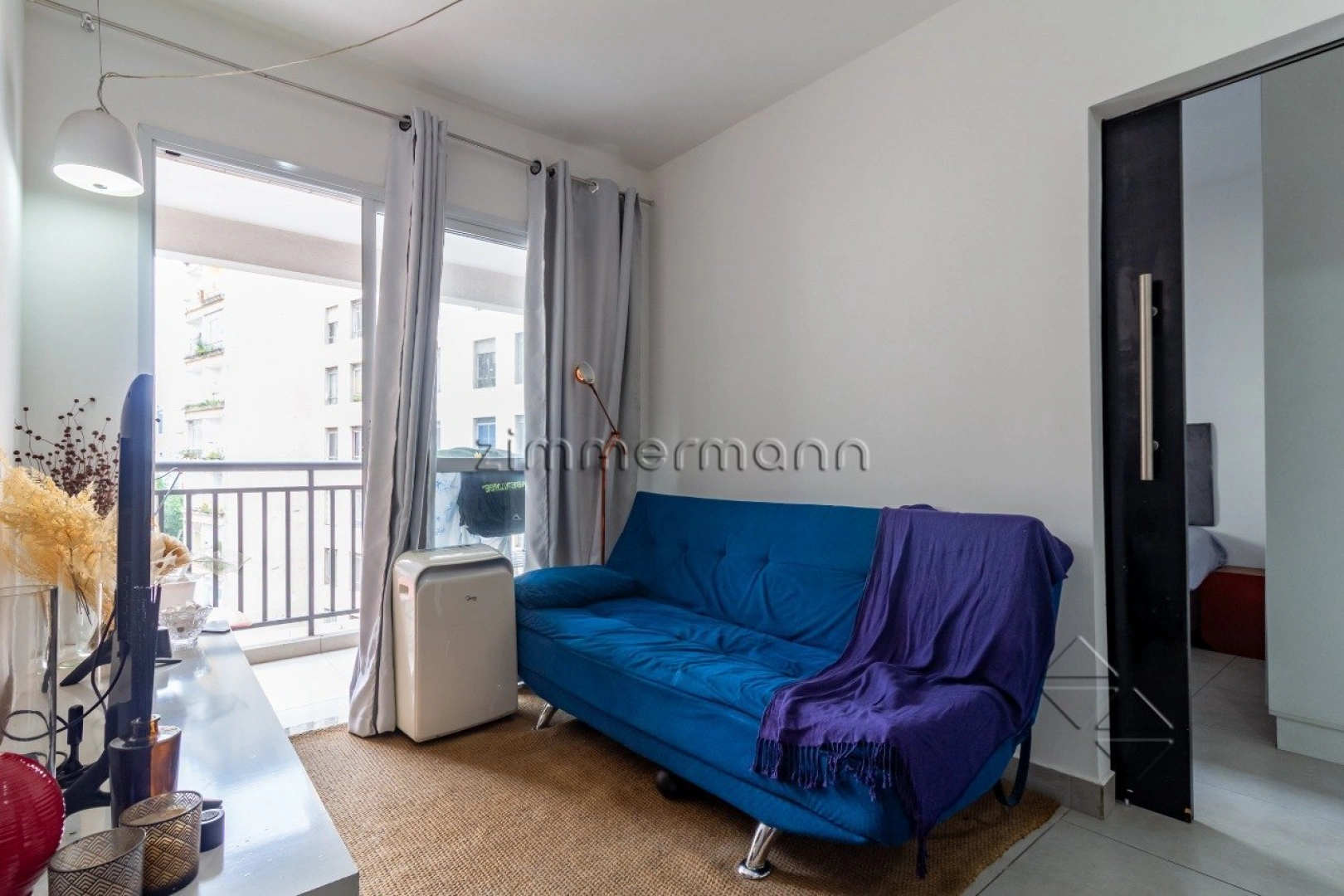 Apartamento mobiliado e aconchegante, com living para 2 ambientes com varanda, cozinha planejada e área de serviço.