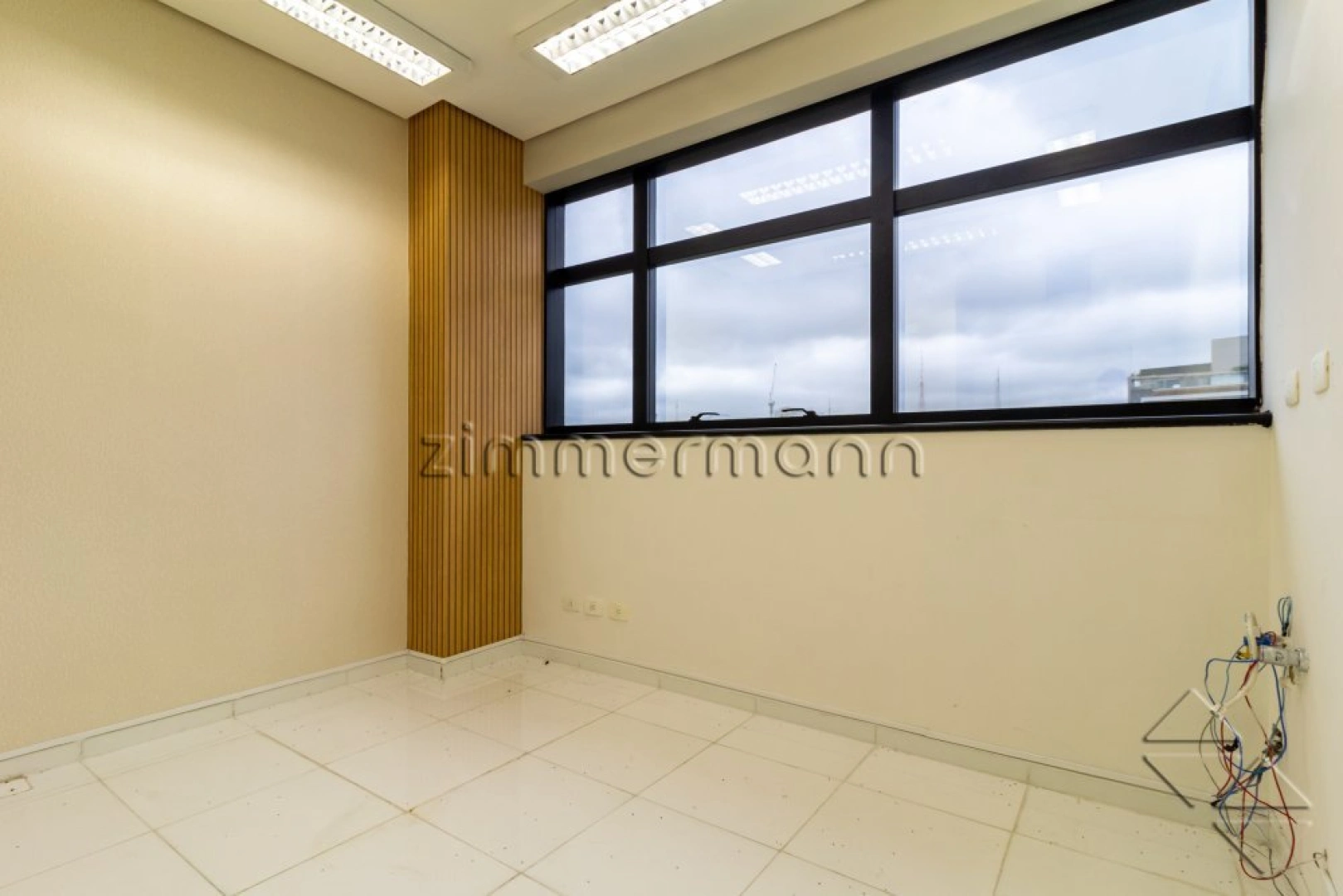 Conjunto comercial com 2 salas com janelões, gabinetes, copa e banheiro.